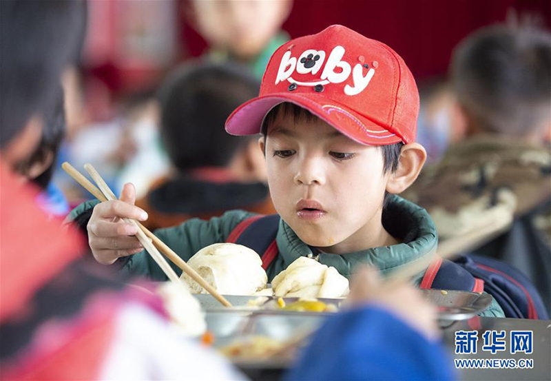 在西吉縣田坪鄉中心小學,學生在享用免費營養午餐(10月23日攝)。(新華社發 楊植森/攝)