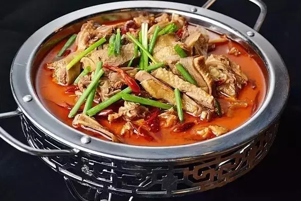 凈鍋放油燒熱,下姜片、蔥節、干辣椒絲炒香后,摻入煮鵝的原湯燒開,倒入鵝肉塊,加鹽、醬油、味精調味。在煮至入味后,舀入明爐小鍋,撒入蔥節便上桌。