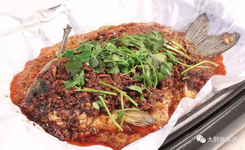 4、鍋留底油燒熱,加自制蒜香醬150克小火翻炒均勻,補少許孜然粉、五香粉、味精,舀取1/4的醬料蓋到盤中洋蔥上,然后放入瀝干油分的草魚,撒一層金蒜,蓋上剩余的醬料,撒香菜梗。