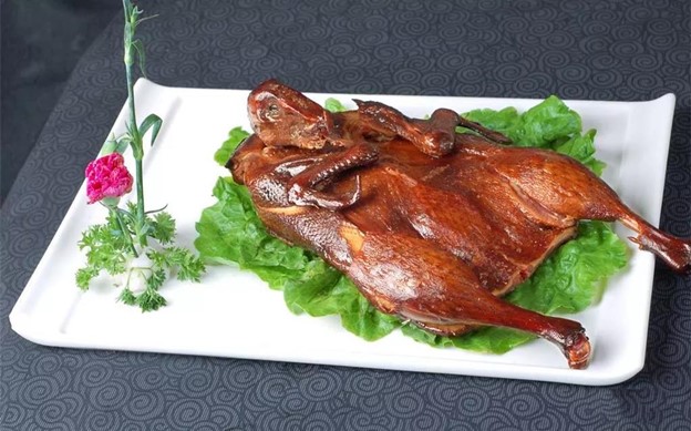 7、上桌前把“醬板鴨”剁成條塊,裝入盤中還原成鴨形,然后用紅油加鹵鴨原汁調勻成紅油鹵汁,淋在盤中鴨塊上,即成。